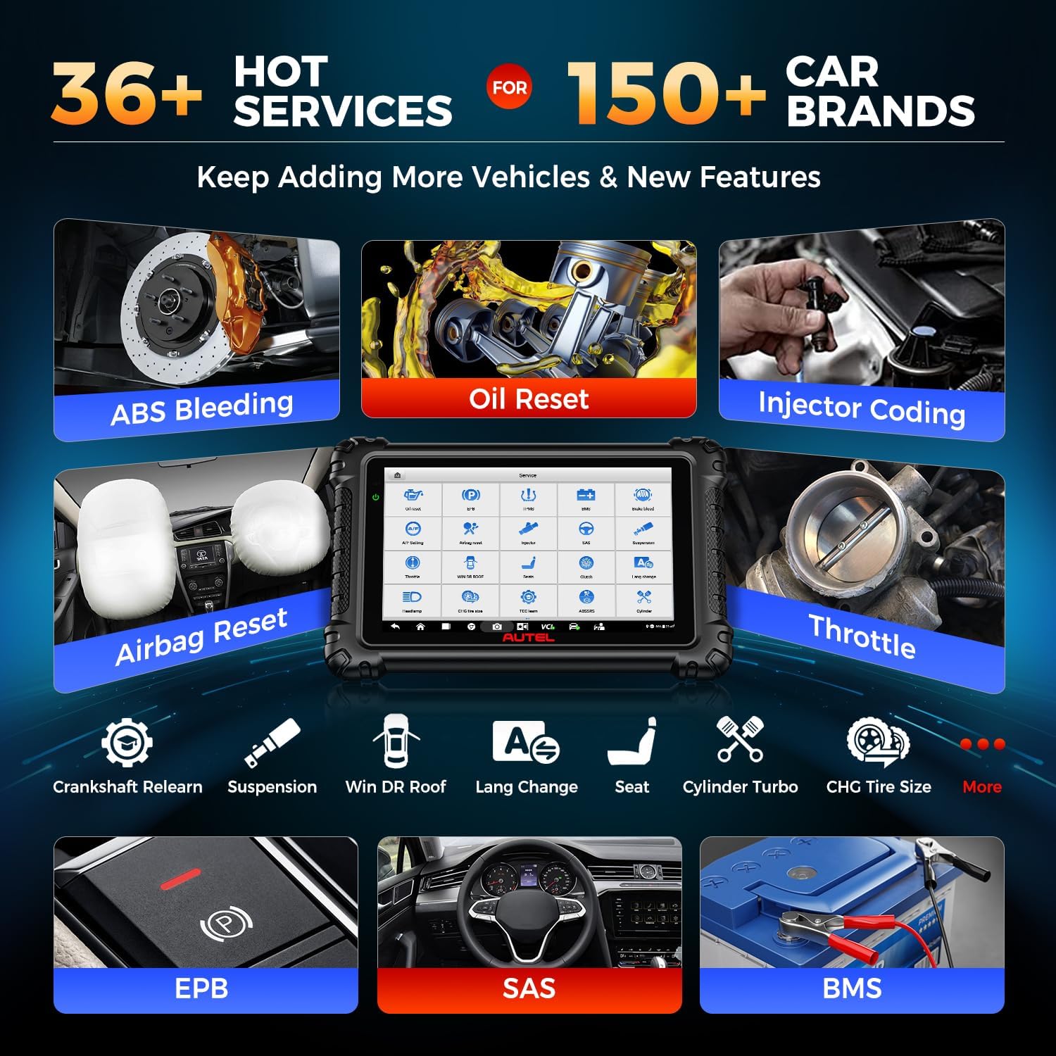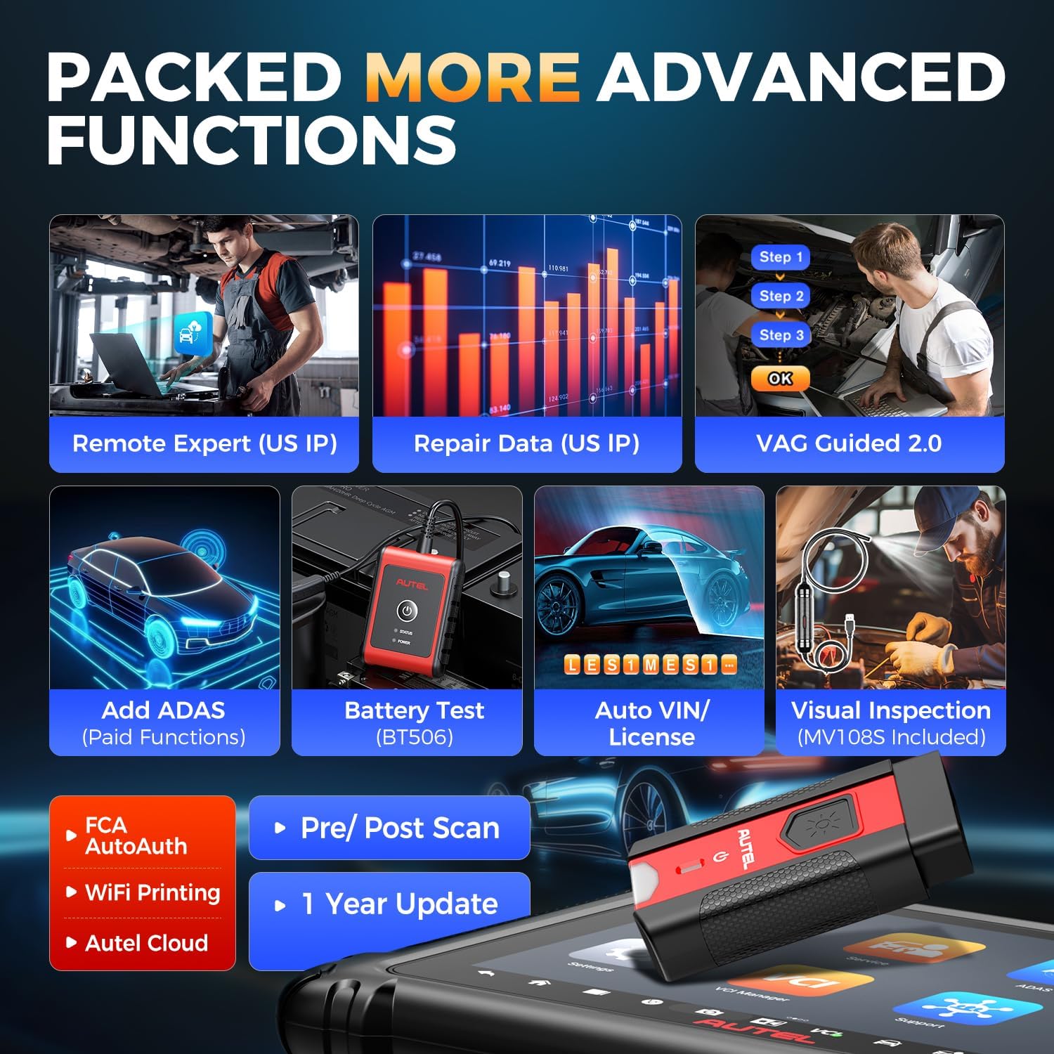 Codificación ECU y codificación ECU offline, instalación programada de módulos, activación de funciones ocultas y guía VAG. Más de 36 funciones de reseteo, más de 3000 pruebas activas, diagnóstico completo de sistemas OE, Auto Scan 2.0, soporte para DoIP y CAN FD, y autenticación FCA AutoAuth. Cobertura del 99% de vehículos, escaneo de VIN y licencias, pre y post escaneo, chequeo de salud de baterías (requiere BT506), inspección digital, impresión vía Wi-Fi y gestión en la nube. Cobertura líder en la industria, trabajando en conjunto con los equipos profesionales de Autel.