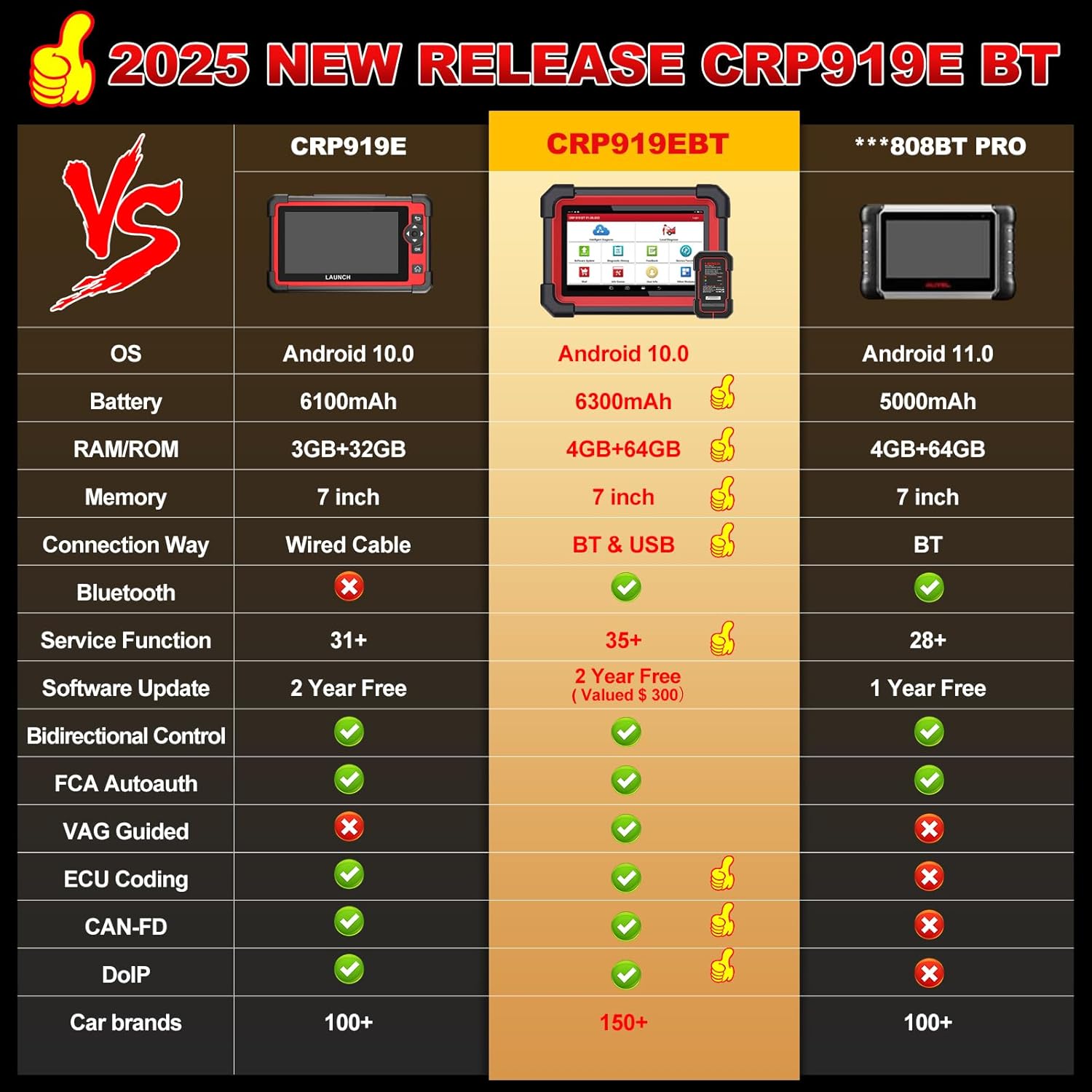 - 🔥【Actualización de hardware y software superior 2025】El escáner inalámbrico OBD2 CRP919EBT de LAUNCH ha actualizado la configuración de hardware superior y añade las funciones más nuevas. El CRP919EBT más rápido e inteligente con 🔥Bluetooth y conexión USB 2 en 1, SO Android 10.0, procesador de alta eficiencia de 4 núcleos de 2.0 GHz, 4 GB de RAM+64 GB de ROM de gran almacenamiento🔥Batería grande de 6300 mAh, diagnósticos más estables y duraderos 🔥Guía V.A.G🔥Codificación ECU🔥 Control bidireccional 🔥Más de 35 reinicios🔥CANFD y DOIP🔥Autonomía automática FCA🔥Diagnóstico completo del sistema🔥Actualización de 2 años🔥Recién agregue probador de batería BST360 y endoscopio I-TPMS y VSP600🔥23+ idiomas🔥100000+ cobertura del vehículo. Proporcione una experiencia de diagnóstico sin precedentes a un precio asequible.