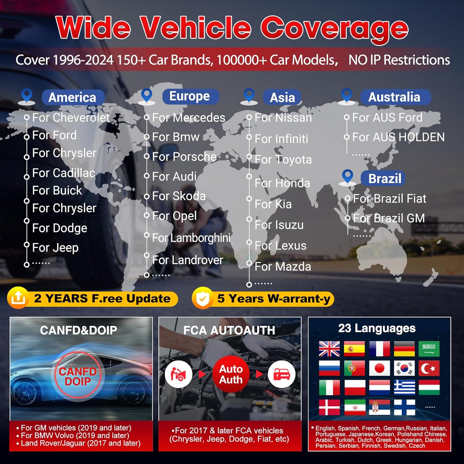 - 🚗【Puede FD, DOIP y FCA, súper protocolo】LAUNCH X431 CRP919EBT está equipado con el conector Bluetooth DBSCAR VII compatible con CAN FD y DoIP. El escáner de diagnóstico automotriz CRP919EBT admite el protocolo CAN FD (compatible con vehículos GM posteriores a 2020). También cumple con los requisitos del protocolo DoIP (el adaptador se vende por separado) para compatibilidad con los modelos BMW (chasis E y F) a partir de 2017. Autoauth para FCA SGW es compatible con vehículos FCA, incluidos los modelos Chrysler de 2017 y posteriores.