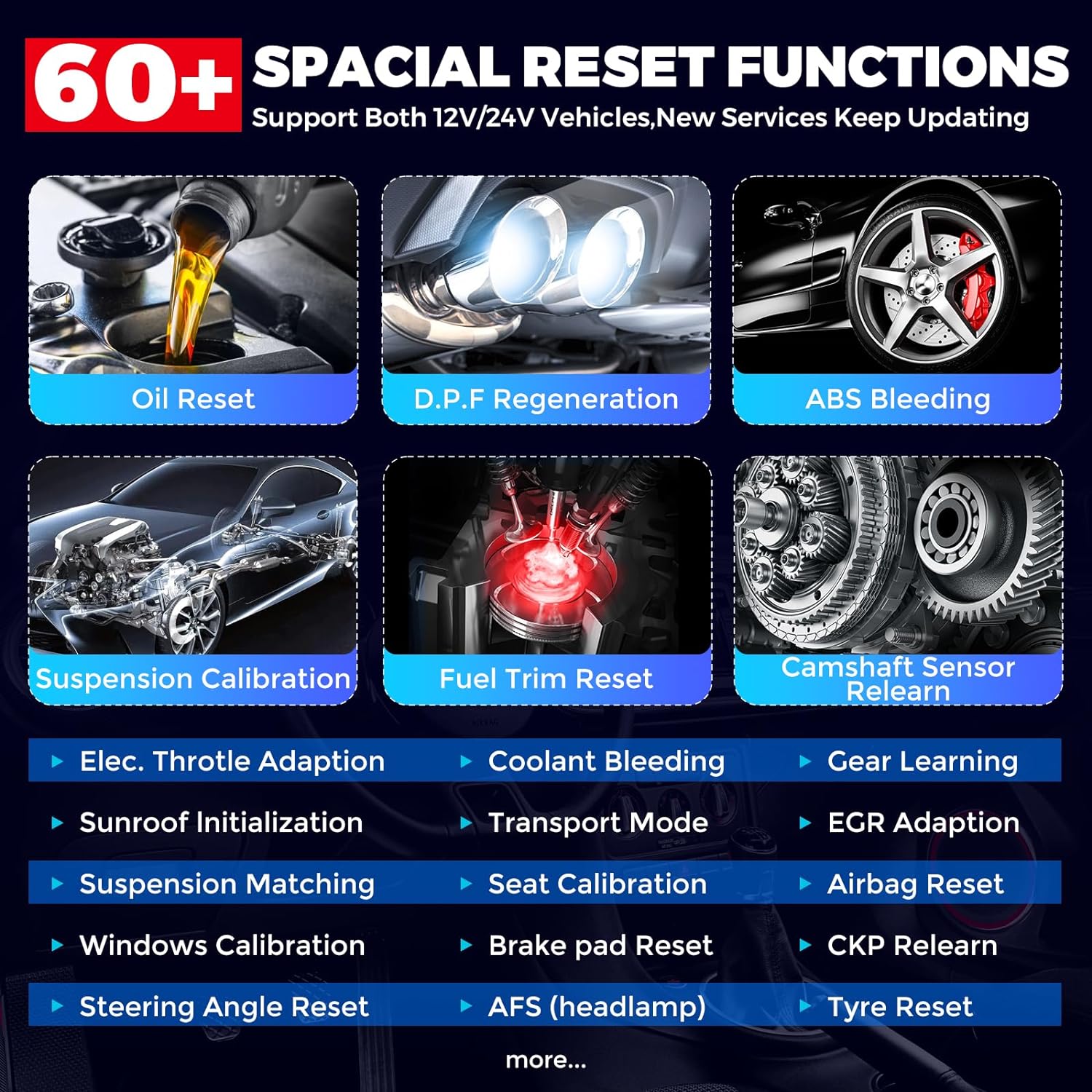 - Más de 60 funciones de servicio con instrucciones paso a paso para resolver todas las cuestiones de mantenimiento y reinicio, abordando el 99% de los problemas del vehículo y gestionando todos los módulos ECU de tu automóvil.