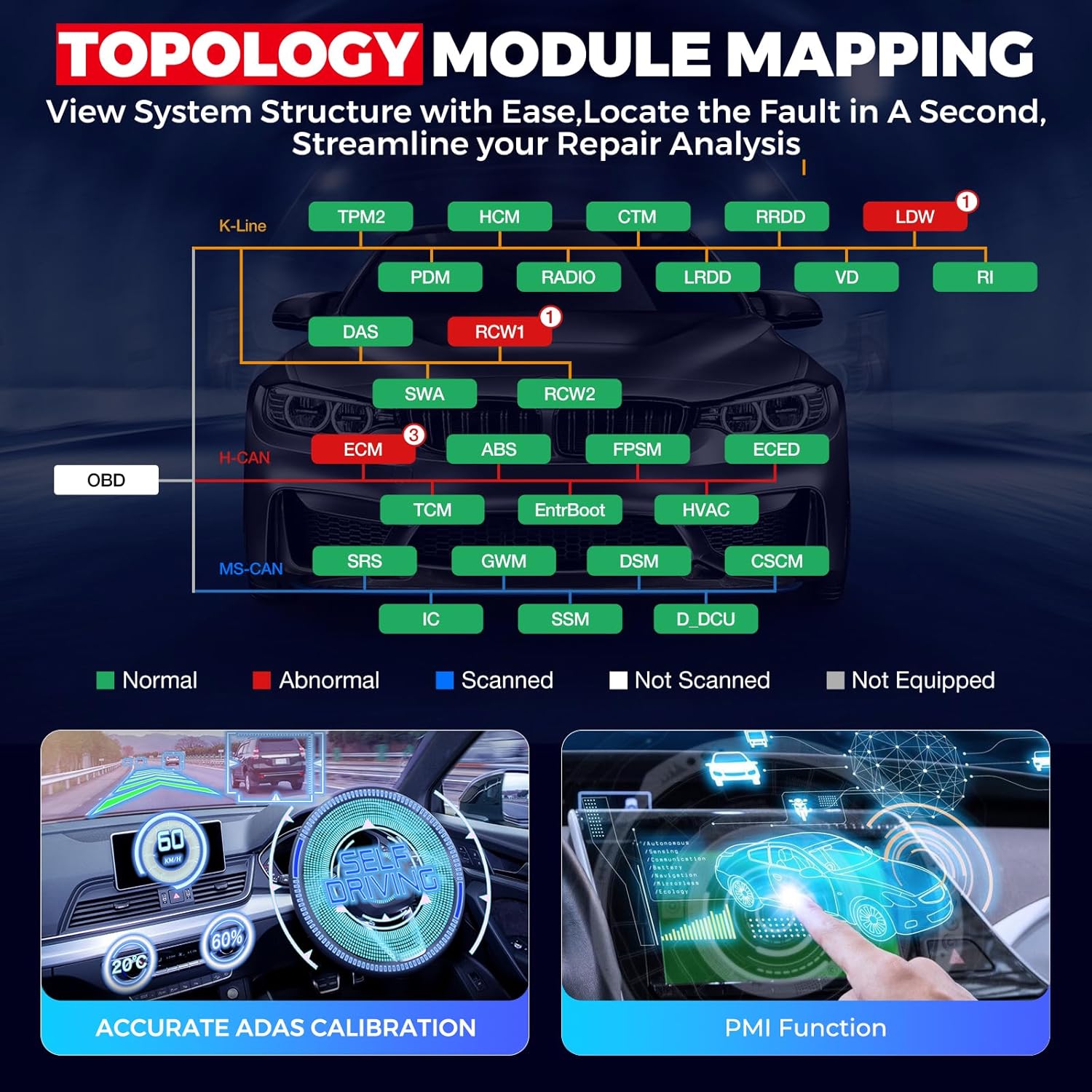 - Diagnóstico inteligente con topología de módulos en vehículos seleccionados, escaneo automático mejorado por VIN, análisis de DTC y asistencia guiada para reparaciones.